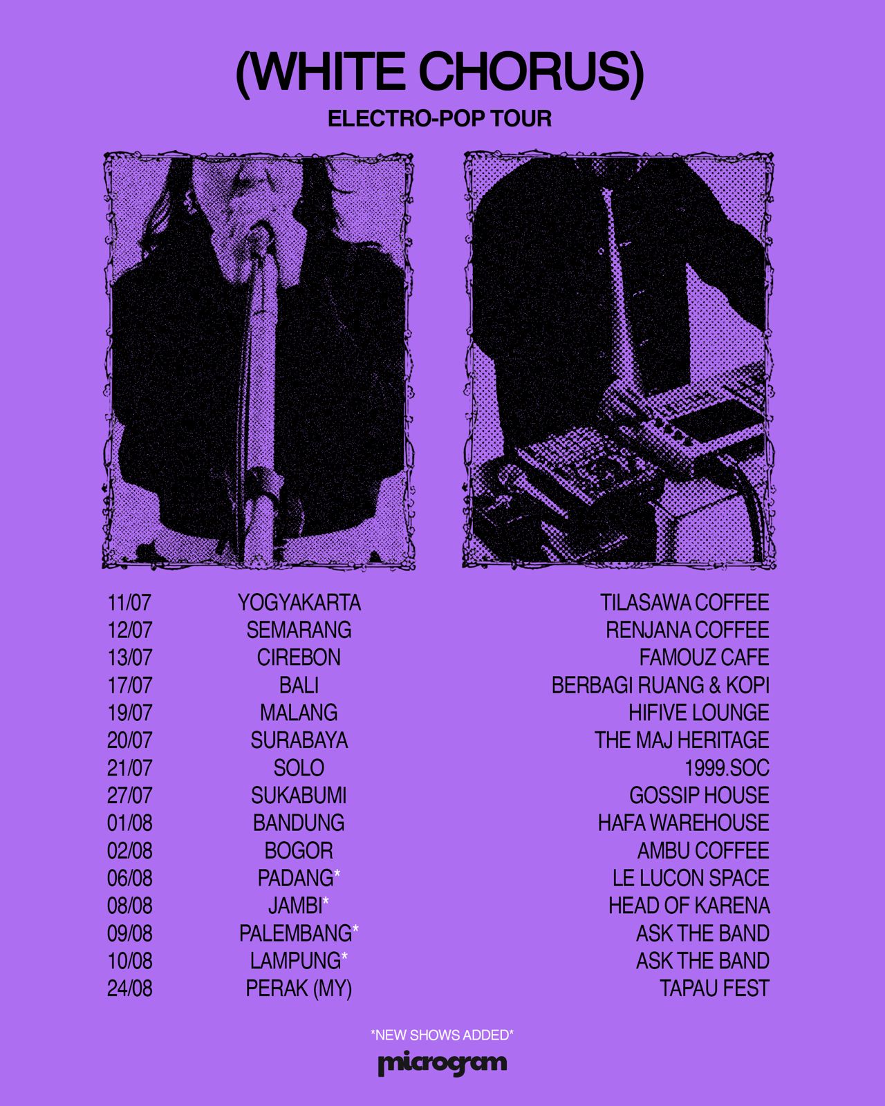 White Chorus, the electro-pop duo from Bandung, embarked on their Electro-Pop Tour in collaboration with Microgram Entertainment, traveling across cities throughout Java and Bali. The tour began in Yogyakarta on 11 July 2025 and continued through cities such as Semarang, Cirebon, Bali, Malang, Surabaya, Solo, Sukabumi, Bandung, and ended in Bogor.